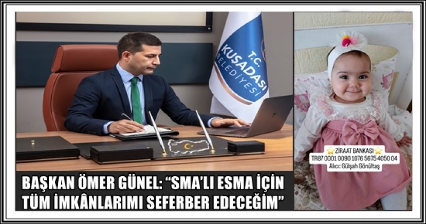 Devletin ücretsiz sunduğu 'spinraza' tedavisine devam eden Esma için Kuşadası Belediye Başkanı Ömer Günel de tüm imkanlarını seferber etti. Minik Esma’nın valilik onaylı kampanyasına destek olmak amacıyla ailesi tarafından İnstagram üzerinden düzenlenen canlı yayına katılan Başkan Ömer Günel, “Esma için elimden geleni yapacağım. Tüm imkânlarımı seferber edeceğim. Ayrıca hemşehrilerimi de kampanyaya destek olmaya yönlendireceğim. Kuşadası’ndaki her alan kampanyada kurulacak stantlar için ailemize açık. Kuşadası’nda daha önce yine SMA’lı bir çocuğumuz olan Çağla Deniz Tunç’un kampanyasını başarıya ulaştırdık. Şu an Dubai’de tedaviye başladı. Esma bebeğimizi de kurtaracağız. Başaracağımızdan emimin” dedi.