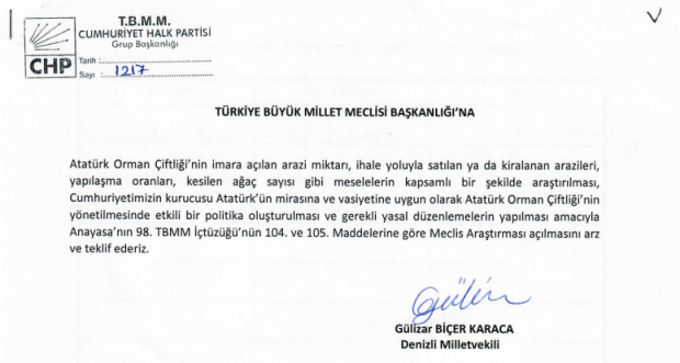 CHP Doğa Haklarından Sorumlu Genel Başkan Yardımcısı Denizli Milletvekili Gülizar Biçer Karaca Atatürk Orman Çiftliği arazilerinin durumunun araştırılması amacıyla TBMM bünyesinde bir araştırma komisyonu kurulması önergesini TBMM Başkanlığına sundu.