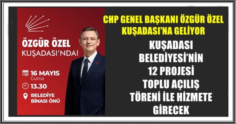 Cumhuriyet Halk Partisi (CHP) Genel Başkanı Özgür Özel, yarın (16 Mayıs Cuma) Kuşadası Belediyesi'nin 2024 yılında tamamladığı 12 önemli projeyi hizmete açmak üzere kente geliyor. Saat 13:30'da Kuşadası Belediye Hizmet Binası önünde vatandaşlarla buluşacak olan Genel Başkan Özel, Kuşadası Belediye Başkanı Ömer Günel ile birlikte toplu açılış törenini gerçekleştirecek.