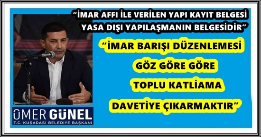 Kuşadası Belediye Başkanı Ömer Günel, imar barışının göz göre göre toplu katliama davetiye çıkaran hukuk dışı bir düzenleme olduğuna dikkat çekerek “İmar barışı garabettir. Hukuka ve fenni usullere uygun olmayan binaların para verilerek yasallaştırılması anlamına gelen imar barışı düzenlemesinin bir an önce ülke gündeminden çıkarılması gerekiyor” dedi.
