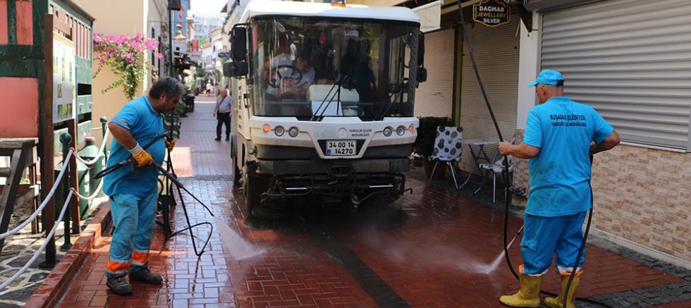 Kurban Bayramı öncesi vatandaşlara kaliteli hizmet vermek için kurban pazarı ve mezbahalarda çalışmalarını tamamlayan Kuşadası Belediyesi, şimdi de cadde, sokak, mezarlık ve camilerde Kurban Bayramı hazırlıklarına başladı. Kuşadası Belediyesi Temizlik İşleri Müdürlüğü’ne bağlı ekipler Kurban Bayramı’nda vatandaşların en çok ziyaret edecekleri mezarlık ve camilerde detaylı temizlik çalışması yürütüyor. Çalışmalar kapsamında cami avluları süpürülerek yıkanıyor. Ayrıca ilçe genelinde bulunan çöp konteynerleri temizlenerek, yıpranan giydirmeleri yenileniyor.