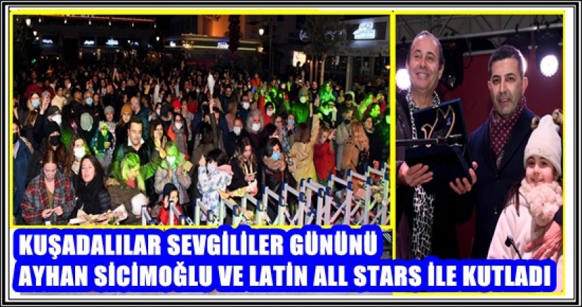 Kuşadası Belediyesi tarafından 14 Şubat Sevgililer Günü dolayısıyla Balıkçılar Meydanı’nda düzenlenen konserde sahneye çıkan Ayhan Sicimoğlu ve Latin All Stars, yüzlerce kişiye müzik ziyafeti yaşattı. Belediye Başkanı Ömer Günel ve eşi Duygu Günel programdan önce çiftlere çiçek hediye ederek Sevgililer Gününü kutladı.