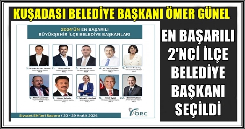Kuşadası Belediye Başkanı Ömer Günel, ORC Araştırma Şirketi tarafından 30 Büyükşehir ve 245 ilçede 15 bin 400 katılımcı ile yapılan ankette en başarılı 2’nci ilçe belediye başkanı seçildi.