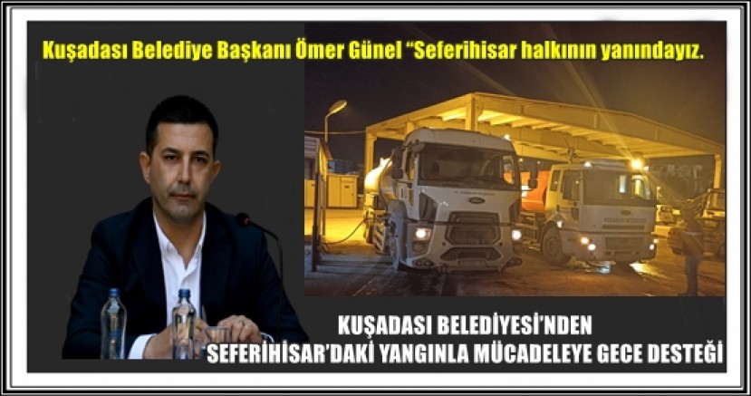 İzmir’in Seferihisar ilçesi sınırlarında bulunan Ürkmez Gümüldür Doğanbey mahallelerinde birkaç gün önce başlayan ve şiddetli rüzgar nedeniyle kontrol altına alınmakta zorlanılan orman yangınıyla mücadele sürerken, Kuşadası Belediyesi dayanışma için harekete geçti.