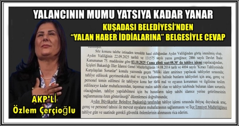 “Yalan” denilen tahliye kararı, Aydın Büyükşehir Belediyesi Emlak ve İstimlak Daire Başkanlığı Kira ve Tahsis Şube Müdürlüğü’nün 24.09.2025 tarihli yazısıyla Kuşadası Kaymakamlığı’ndan tahliye talebinde bulunduğunu gösteren resmi evraklarla ortadadır.