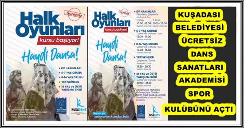 Başkan Ömer Günel öncülüğünde gerçekleştirdiği kültürel ve sosyal faaliyetlerle adını tüm Türkiye’ye duyuran Kuşadası Belediyesi, kültür ve sanat etkinlikleri ile sanata ve sanatçıya verdiği desteği her alanda gösteriyor. Bu kapsamda Kuşadası Belediyesi kentte faaliyet gösteren ve bugüne kadar ulusal, uluslararası pek çok yarışmada önemli başarılara imza atan halk dansları topluluklarının yeni bir mekâna kavuşmasına öncülük ederek Dans Sanatları Akademisi Spor Kulübü’nü kurdu. Çocuk ve gençler başta olmak üzere kent sakinlerine yeni eğitim alanları açmak ve çocukların enerjilerini ve potansiyellerini Anadolu kültürünün bir parçası olan yöresel halk danslarına ve spor aktivitelerine yönlendirmek amacıyla kurulan Akademi bünyesinde ilk etapta Türkiye’nin farklı yörelerine ait ücretsiz halk oyunları eğitimi verilecek.