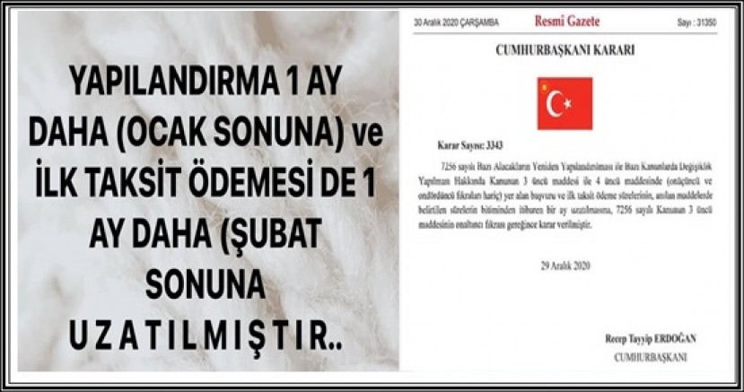 31 Ağustos 2020'den önceki dönemlere ait ve 17 Kasım 2020 itibarıyla kesinleşen borçları kapsayan yapılandırma kararı için başvuru süreci 31 Aralık 2020 tarihinde sona eriyordu. Resmi Gazete'de yayımlanan karara göre süre uzatıldı.